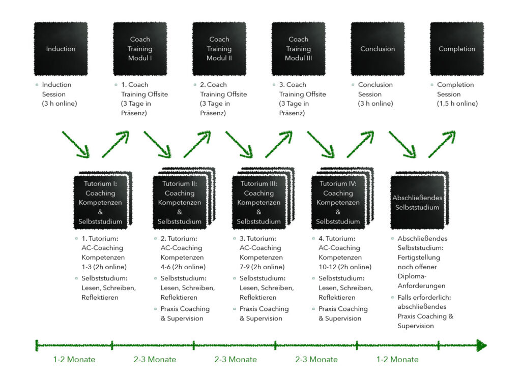 Vor, zwischen und nach den drei Blöcken finden Online-Module, umfangreiches Selbststudium, weiteres Praxis-Coaching sowie Einzel- bzw. Gruppen-Supervision statt.