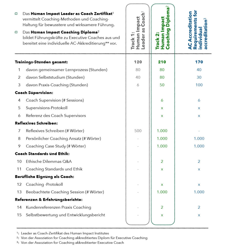 Das Human Impact Coaching Programm bietet den Teilnehmenden zwei Tracks: zertifizierter „Leader as Coach“ (Track 1) und diplomierter Executive Coach (Track 2).