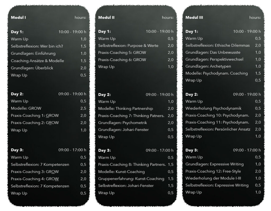 Die drei Blöcke finden regelmäßig auf Deutsch oder Englisch in der Schweiz oder in Deutschland statt und umfassen in Summe: